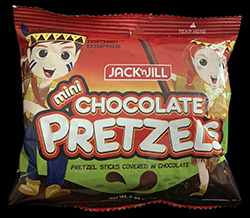 I have some issues with this snack, and it starts with the description on the package. One of the most important pieces of information about this snack is hidden in the small print under the name of this snack. Just below the word “pretzels” the package describes these as “pretzel sticks covered in chocolate”. While I can’t say that the folks at Jack ‘n Jill lied about what’s in the bag, they kind of imply that you’re getting full twisty pretzels by the name.