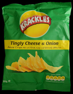 My belief is that the word tingly was a choice by someone at The Snack Factory who may or may not have had a firm grasp of the English language. I really can't imagine anybody in any English-speaking marketing department making this choice. The first reason I believe this is that these chips did not make me tingle in any way at all. As far as cheese and onion chips go, they were very average. More importantly the cheese flavour was actually the more subtle of the two flavours, thus I would say that these chips were closer to being cheese and tingly onion flavoured.