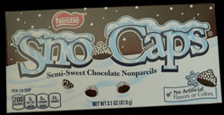 This candy suffers from expectation problems, or at the very least what I was expecting when I opened them. I thought I was going to have little mountains of chocolate covered in white sprinkles. Very broadly, that is what these are, there is one detail however that was different than what I expected, and I didn't like it. These are little mountains covered in white sprinkles, but they were really small. I was expecting something about as big around as a dime at the base, but these were much smaller than that. In fact, each Sno Cap was exactly the same size as your average chocolate chip.