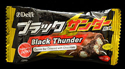The description of this bar is “cookie bar covered with chocolate”, and that’s pretty much what you get. The cookie in this bar is actually pretty good, and it is sort of unique. It tastes fairly chocolaty, and it’s got a nice crunchy texture. What I really found unique was the way that the cookie was presented. Normally cookies are just flat bars or disks with one solid colour all the way through, unless it’s something like a chocolate chip cookie or a cookie with some other type of ingredient. This is a pure cookie, but it’s made up of globs of cookie instead. What makes this interesting is that all the globs aren’t the same colour, there are both white and black cookie globs throughout the bar. It could have been a little better if the cookie colours each had a unique flavour, but I wasn’t too disappointed with the pleasant chocolate flavour that was offered throughout.