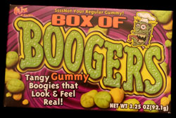 It's kind of obvious to make gummy candies with a booger theme. Those who don't like gummies often say that the texture is the biggest problem, and one can likely associated the texture of gummies as that of boogers. Although it seems like a given, I can imagine that it would be a hard sell to candy eaters of the world. At best you'll have a few people buying gummy boogers as a novelty, it's likely that most people wouldn't seek these out. The only way this candy could go beyond novelty is if it tasted fantastic.