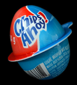 There are a few things that I don't understand about this egg. First of all, they're sold in the same package and box type as Cadbury Cream Eggs, but they're not made by Cadbury. Even the egg on the inside is exactly the same as the Cream Egg. Secondly, they're supposed to be a Chips Ahoy candy, yet there's nothing really cookie like about these at all. The most I could say is that the cream in the middle looks a little like raw cookie dough, but the texture is wrong.