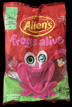 I don’t normally comment very much about the names of candies on this website. It probably factors somewhat when I’m looking at the novelty of a particular treat, but for the most part I don’t really give it much thought. These “Frogs Alive” gummies on the other hand need some notice. These are Australian gummies, so it could be that there’s some kind of context that goes along with the name. Maybe it has something to do with the fact that Australia once (and maybe still has) an infestation of frogs that all but destroyed a portion of their natural ecosystem. Maybe taking vengeance on live frogs was considered okay.
