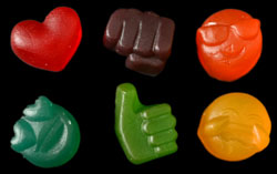 The concept is where these gummies do OK. Emojis are pretty hip right now (the kids still say "hip" right?), and they've even made it into our regular daily language. My mother knows what an emoji is, so it's not just hip, but also somewhat universal. From a communications standpoint (I have a degree in Communications), I think emojis are fascinating because they've become a way to express emotion, without using words. In some ways it plays on the idea of a picture saying 1000 words. Emojis are also a language that crosses all borders and cultures. It doesn't matter what language you speak; a happy face is understood. So, I guess I like these gummies because they make me think, they're also recognized by so many people, even if you don't use a computer. The message is pretty clear and really crosses all language barriers.