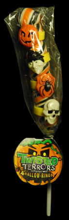 The reason I wanted to stall this review is because as candies go there really isn't much to say about this lollipop. It's got black, orange and white stripes, it's kind of long, and it is orange flavoured. I'm not saying that this is a super common lollipop, either. It's pretty tall (about 3 or 4 inches) it comes with 4 rings (the scull one being the coolest) and it also looks fairly hand made. I guess my problem, as a "Candy Critic" is that it's all flare and nothing really original flavour or texture wise.
