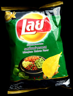 After the first bite these chips don't go spicy, but they actually go sweet. They're sweet with a hint of lime, with little to no heat at all. It's an amazing shock considering what I was expecting, but I'm really happy about it. I still don't know what "miengkam krobros" is, but after eating these chips I'm keen to learn more.