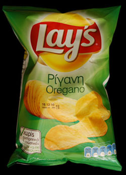 I always thought that Canada had the market cornered on fun flavours of potato chips, but I'm wrong. Granted I've seen a lot of the wackier flavours of chips in Canada (I’m looking at you Cinnamon Bun Lay’s). It would appear that fancy flavoured chips are truly an international treat idea. I'm not sure if it's always been this way, but I'm glad I live in a time to see it. This Greek bag of chips not only provides with a great flavour, but it also says a lot about the Greek culture.