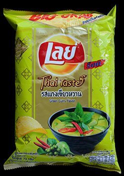 It might seem fairly obvious, but how much you like these potato chips depends greatly on how much you enjoy Thai green curry. Many people seem to lump curries into one flavour or group. There's an assumption to some that all curries are exactly the same, this is not the case at all. The definition of the word curry is just a food cooked with an assortment of spices, and often spicy. What kind of spices you use can change drastically depending on where you are in the world. For example, green curries often have a great deal of Thai basil in them, while other curries might not have any basil at all. In general, the only ingredient you find in almost all curries is some form of hot pepper, but even the variety of that can change depending on where you get your curry.