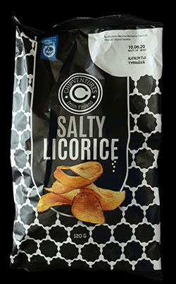 In theory, salty licorice potato chips should not work at all. This should just be a gimmick where you buy a bag of these chips as a joke for you and your friends to eat and talk about what a silly idea it is to mix potato chips with licorice. It could also be a gimmick to talk about the Finnish obsession with licorice, since these chips are made in Finland, and they are truly obsessed with licorice. This is all well and good, but the people at Chipventures did one thing to ruin this perfect silly gimmick, they made the chips very well.