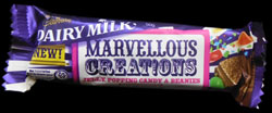 The promise of this bar is to take the classic Cadbury Dairy Milk and toss in a whole bunch of crazy ingredients. In this case the crazy ingredients are jelly (gummies), popping candy (pop rocks), and beanies (you might think jelly beans but in fact it's more of an M&M or Smartie). Each of these ingredients contributes differently and to a different degree in this bar.
