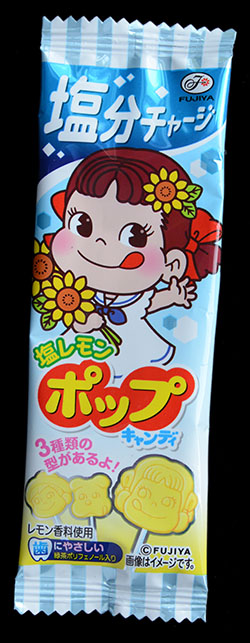 This lollipop could be seen as an average lemon lollipop except for two very distinct features. The first, and most obvious feature is the shape. It's in the shape of a little girl's head. That's only a little weird considering the brand that puts it out, Fujiya. This little girl, depicted on the package as well, is the mascot for the Fujiya company, and she seems to appear on many of their candies, or at the very least their packages. So while it was a little weird sucking on a little girl's head, it wasn't totally unexpected.
