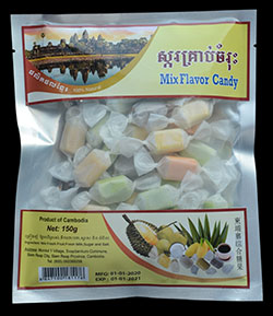 For now I’ll talk about where this candy gets complicated, and that is in the package, and how it relates to the flavours. There are six different fruits/flavours represented on the package, durian, guava(?), pandam, coconut, mango, and coffee. Also pictured on the package are four different colours of candy, yellow, white, green and brown. Where this gets complicated is that inside the package there are five different colours of candy, brown, green, orange, dark yellow and light yellow. There are also no hints as to what the flavours might be on the package either, the only thing is says in this regard is “mixed fresh fruit” (seeing as coffee and maybe coconut are not fruits this is extra complicated). So basically I had only a few guesses as to what flavour each one of these candies might be. After eating them, I had a bit of a better idea, but the package was still very confusing.