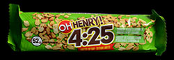 First off, there is no marijuana or anything like that in this bar. Secondly, I'm not very sure that this is an Oh Henry bar. Sometimes with treats that have a modified variety, you find that the change makes them so different that they don't really reflect the original. This bar treads so closely on that line that I'm having a really hard time deciding if you could still call this an Oh Henry bar. The thing it has is the big log of fudge in the middle (or at least something very similar), it also has peanuts, but I can hardly say that peanuts make the Oh Henry bar original. The parts that are missing are the sticky caramel that would hold the peanuts together, and the chocolate coating, something I consider pretty important to an Oh Henry bar.