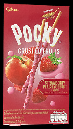 This seems like a new direction for Pocky. Fruit flavours are not new, neither is having a new texture, but this Pocky feels like it’s trying to promote itself as being healthy. The fact that the cookie sticks are made with “whole wheat” and that the fruit is real is mentioned many times on the package. Yoghurt is also mentioned a few times as well. While I’m no nutritionist, I really have a hard time imagining that this cookie like treat is healthier than most of the average Pocky out there. It also didn’t really taste particularly healthy.