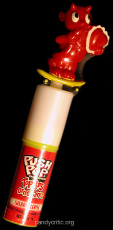 If I had to describe Push Pops I would describe them as basically a cross between lipstick and a lollypop. I think it’s a pretty good candy concept since it's retractable and since it has a lid, if you don't finish it in one go you can save it for later without any chance of hair or dust getting into it. The little devil guy riding a skateboard on the top doesn't do much for the treat... well at all. He pretty much just looks glued on for the sake of giving this treat a Valentine’s Day theme.