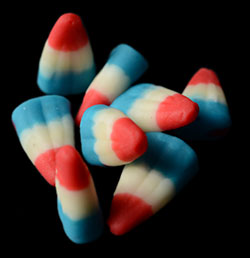 My theory about this treat is that it's a candy corn that's supposed to emulate those rocket popsicles. The flavour is also supposed to represent the often lemon and fruity flavour of those popsicles. It's also very clever/fortunate that candy corn kind of have the same look as those rocket popsicles. I think as a concept these work in a rather creative way, assuming that this is what they were going for. I'm not 100% sure of this connection since I bought these at a bulk food store, and all the sign said was “Raspberry Lemonade Candy Corn”. It could be that I'm filling in some kind of random gaps to make these work in my head.