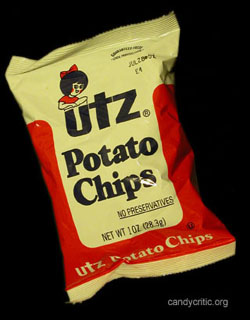 So, you might be wondering what made me pick up this bag of potato chips? Was it the creepy girl on the package? Was it the cool fact that they don't spell the name of the company with any upper-case letters? Nope, it was simply the fact that here at candy critic (thought I'd try no capitols too) we have not one treat review that starts with the letter “U”. I've been looking for a while too, so just seeing these made me smile.