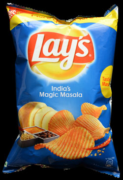 One of the things I've learned over the last few years is the definition of the words "masala" and "curry". I used to think that they were the names of particular spices, like jalapeno peppers or mint. As I became more educated on the subject I discovered that they were in fact spice combinations, but I thought they were a particular blend of spices. I now know that masalas and curries are in fact random blends of spices from the subcontinent, they vary as widely as ice cream flavours or potato chip flavours. All of this leads to this bag of potato chips.