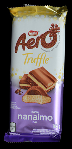 I might have to explain this bar to some people. I’m not sure how many people have Aero bars, but I’m pretty sure only Canadians (or friends of Canada) know what a Nanaimo bar is. An Aero bar is a chocolate bar filled with tiny little bubbles, they’ve been around as long as I know and have always come in interesting flavours. Nanaimo is a town on the west coast of Canada that happens to be famous for a baked dessert treat called a Nanaimo Bar. The treat consists of a piece of dense cake with coconut, a yellow custard, and it’s topped with a hard chocolate coating. This dessert has found its way all over Canada, and for me is a way to know if a bakery I’m visiting overseas has any Canadian roots. It’s like a secret bakery calling card for Canadians.