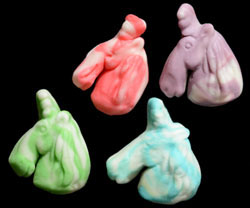 There are several things about these gummies that just isn’t working. I understand that unicorns are very trendy today, particularly (and strangely) in the food industry. Just because an idea is trendy, doesn’t mean that you should just put out a candy without giving it much thought or quality though. The first problem with this candy is the shape. Sure, it looks like a unicorn, but only sort of. The misshapen gummies look like some of the most terrifying/sad unicorns I’ve ever seen. The fact that they’re assorted bright colours and all swirly is a plus, but not enough to get over the weird shape.