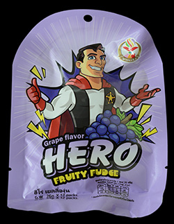 It’s funny because the mystery of what a fruity fudge might be hid the other unique thing about this treat, and that’s the shape. I never really thought much about how one could present a gummy candy with a hero theme, but the folks at Youli certainly gave it a try. Inside this bag is one giant purple gummy in the shape of a human. I would say that the detail isn’t great, but it’s certainly recognizable. The odd feature is that this purple human is stuck on a small plastic stick. This meant that the first bite I had to take was of the head. This didn’t really make my treat very heroic, but it was unique.