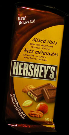 With the case of this Hershey’s Mixed Nuts bar, as always, things seem to work fairly well. The chocolate is a nice quality, fairly smooth and creamy. The nuts seem pretty tasty as well, they seem fairly fresh and crunchy. I do however have two problems with this bar, but keep in mind they are pretty minimal ones. First of all, the nuts aren't that flavourful, I'm not sure why either. I can't really taste them, although they do create a nice texture. Maybe I'm just being a little too nitpicky.