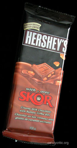 This is a little strange if you think about it. This is a chocolate bar with bits of another chocolate bar inside it. It's like the chocolate bar universe has collided to make a super chocolate bar. I guess the safe thing is you know that the basic idea is going to work. We already know that both of these bars (the Skor bar and the Hershey bar) work as chocolate bars. I also know that I like the Skor bar and I know it works with chocolate because it’s coated with chocolate. This is a sort of super chocolate Skor bar more than anything else.