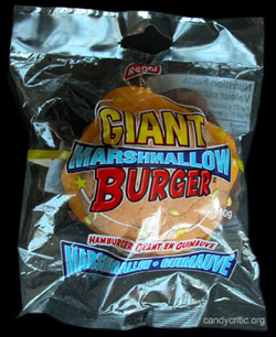 I have no idea what I'm thinking. I'm not a huge fan of marshmallow, at least in large quantities. To mould it into an almost-life-sized meaty treat doesn't really make it more appealing at all either. When I first saw this treat, I thought it was some kind of novelty pincushion. I've actually held onto this treat for a little while, so I could impress my friends with it. But the time has come; I'm alone in my office staring at this crazy burger wondering if being a "Candy Critic" is really a good gig.