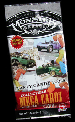 Looking at this bag of treats you know one thing; you're buying it for the novelty. Sure, the candy might be ok, but if it's not, you know you're still going to get something cool from the television show Monster Garage. So, did I get what I expected? Yep, I got a cool card with a picture of one of the Monster Garage creations on it, and best of all it moved when you tilted the card. Having said that, this site is not about card collecting, although if anybody has the card depicting the famous hearse from the show and would be willing to trade for the mail truck, I'm game.