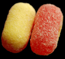 I guess what I'm saying is, I like rhubarb candies, and I really like rhubarb candies that give you a nice sweet and sour combination. If I were to judge these next to other rhubarb candies, I would say that I don't really like them. The thing is, these aren't just rhubarb candies, they're rhubarb custard candies, and as far as that goes these are really good. The cream flavour is evident; the rhubarb flavour is good and very obviously rhubarb.